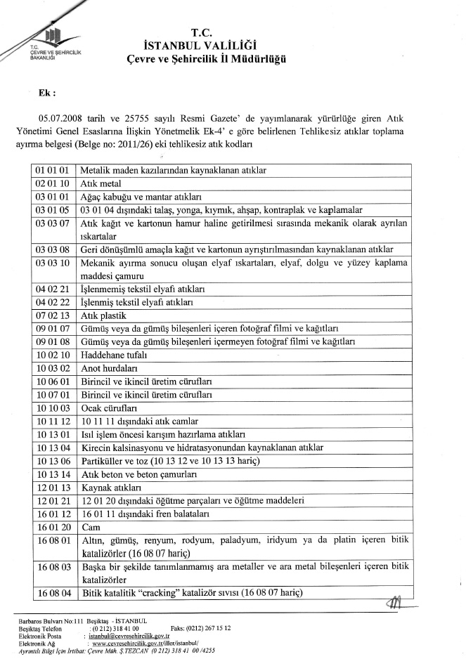 Tehlikesiz Atık Toplama Ayırma Kodları 1